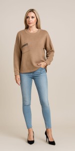 Swobodny krój z obniżoną linią ramion gwarantuje wygodę i modny wygląd. Sweter posiada ozdobną kieszonkę na piersi z subtelnym zdobieniem, która dodaje całości charakteru.