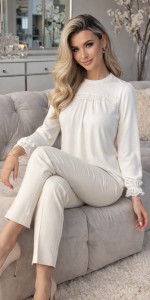 Luźniejszy, swobodny fason pięknie układa się na sylwetce, a długie rękawy zakończone delikatnym marszczeniem zapewniają wygodę i estetyczne wykończenie. Bluzka doskonale sprawdzi się zarówno w stylizacjach codziennych, jak i eleganckich – idealna do spodni materiałowych, jeansów lub spódnic.