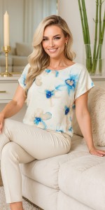 Stylowa, kobieca i niezwykle wygodna bluzka, która doda świeżości każdej stylizacji. Delikatny kwiatowy print w odcieniach niebieskiego i beżu nadaje całości subtelnego, eleganckiego charakteru.