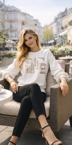 Stylowa, wygodna i efektowna – ta bluza świetnie sprawdzi się w codziennych stylizacjach, dodając im elegancji dzięki subtelnej aplikacji z połyskiem.