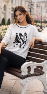 Bluzka SUNWEAR SM023-5-08 to stylowa propozycja dla kobiet ceniących minimalistyczny design z wyrazistym akcentem. Model utrzymany jest w klasycznym białym kolorze, który stanowi doskonałe tło dla efektownego, graficznego nadruku w kolorze głębokiej czerni. Motyw przedstawiający sylwetki kobiet nadaje bluzce modnego, artystycznego charakteru.