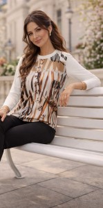 Bluzka SUNWEAR SM034-5-67 to stylowa propozycja dla kobiet, które cenią wyraziste wzory w eleganckim wydaniu. Model utrzymany jest w harmonijnej palecie barw: ecru (złamana biel), beż, karmel, ciepły brąz oraz akcenty czerni. Dynamiczny, artystyczny print na przodzie nadaje całości nowoczesnego charakteru, jednocześnie pozostając w stonowanej, naturalnej kolorystyce.