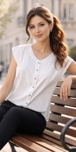 Bluzka posiada subtelny dekolt w kształcie litery V oraz ozdobny panel z dekoracyjnymi guzikami z przodu, które nadają całości eleganckiego charakteru. Krótkie, luźne rękawki delikatnie osłaniają ramiona, zapewniając komfort i swobodę ruchów. Fason jest lekko swobodny, dzięki czemu model pięknie układa się na sylwetce i sprawdzi się zarówno w stylizacjach biurowych, jak i codziennych.