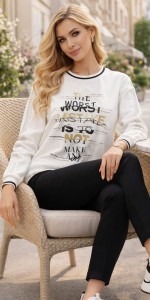 ZAPS – Biała bluzka z ozdobnym napisem i ażurowymi lampasami na rękawach | Luźny fason