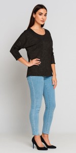Dekolt w łódkę pięknie podkreśla linię szyi, a lekko opadające ramiona dodają bluzce nowoczesnego charakteru.
