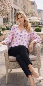 Stylowa i niezwykle kobieca bluzka marki ZAPS to doskonały wybór dla kobiet ceniących elegancję połączoną z wygodą. Model o luźnym, niedopasowanym kroju pięknie układa się na sylwetce i zapewnia komfort noszenia przez cały dzień. Delikatny pudrowo-różowy kolor tkaniny został ozdobiony subtelnym lawendowo-fioletowym wzorem przypominającym akwarelowe kwiaty, co nadaje całości romantycznego i świeżego charakteru.