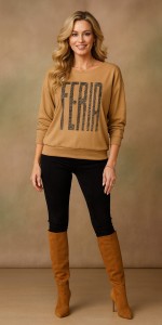 Stylowa bluzka damska Feria w kolorze beżowym to połączenie komfortu i nowoczesnego designu. Model o długości od pachy 37 cm świetnie podkreśla sylwetkę, a jednocześnie zapewnia swobodę ruchów. Na przodzie wyróżnia się modnym nadrukiem FERIA, który dodaje całości charakteru i sprawia, że bluzka staje się wyrazistym elementem każdej stylizacji.
