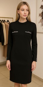 97 Czarna Sukienka z Ozdobnymi Kieszonkami i Detalem na Rękawach