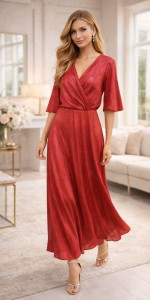 112 Czerwona brokatowa sukienka maxi z kopertowym dekoltem – elegancka, z podszewką | Inter Irex