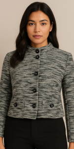 Długość od pachy wynosi 29 cm, co sprawia, że żakiet ma zgrabny, krótki krój – idealny do spodni z wyższym stanem czy spódnic ołówkowych. Długie rękawy dodają elegancji i czynią go odpowiednim wyborem również na chłodniejsze dni.