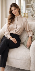 Wyjątkowo kobieca bluzka marki VERA MONI to połączenie klasy, delikatności i ponadczasowej elegancji. Model zachwyca szlachetnym, jasnym odcieniem champagne / jasnego beżu, który pięknie rozświetla sylwetkę i dodaje stylizacji luksusowego charakteru. To idealna propozycja zarówno do pracy, jak i na eleganckie wyjścia.