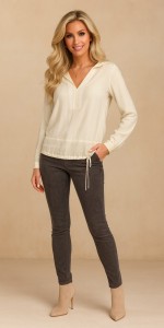 Długość od pachy wynosi 37 cm, dzięki czemu bluzka prezentuje się zgrabnie i jest idealna zarówno do spodni, jak i spódnic. To uniwersalny model, który świetnie sprawdzi się na co dzień, do pracy w mniej formalnym stylu czy na weekendowe spotkania.