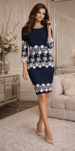 Granatowa baza zestawu została efektownie przełamana białym, dekoracyjnym wzorem inspirowanym motywem winogron, co nadaje całości wyjątkowego charakteru i wyróżnia ją spośród klasycznych garsonek biurowych. Komplet doskonale sprawdzi się jako strój do pracy, na spotkania biznesowe, firmowe kolacje czy oficjalne uroczystości.