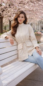 Model wyróżnia się subtelnym, minimalistycznym designem oraz dopracowanymi detalami. Delikatnie taliowany krój z regulacją w pasie (ściągacz ze sznurkiem) pięknie podkreśla sylwetkę, a klasyczne zapięcie na guziki dodaje całości elegancji.
