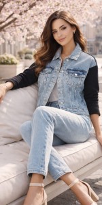 Model wyróżnia się klasycznym jasnoniebieskim (błękitnym) denimem z przodu i na tyle, zestawionym z gładkimi czarnymi rękawami, które nadają całości oryginalnego, lekko sportowego charakteru. Subtelne przeszycia i metalowe guziki podkreślają casualowy styl, a dopasowany krój pięknie układa się na sylwetce.