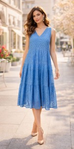 Delikatny, ażurowy wzór nadaje sukience romantycznego charakteru, a lekko rozkloszowany fason pięknie układa się na sylwetce, podkreślając jej atuty. Model posiada podszewkę, dzięki czemu jest wygodny i nie prześwituje, gwarantując pełną swobodę i pewność noszenia.