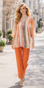 Elegancki komplet damski Inter Irex – lekka tunika + spodnie w modnym odcieniu koralowym