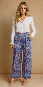 Kolorowy, orientalny wzór paisley w odcieniach niebieskiego, różu i bieli sprawia, że spodnie wyróżniają się w każdej stylizacji – świetnie wyglądają zarówno z prostą białą bluzką, jak i bardziej elegancką koszulą.