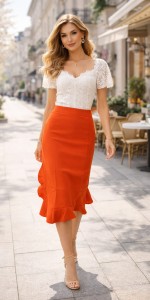 Tytuł produktu: Elegancka spódnica z falbaną MOE – kobieca midi w energetycznym kolorze | AliasOutlet