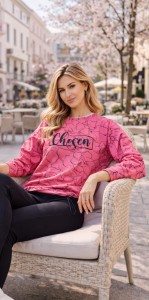 Model wyróżnia się modnym, kobiecym designem. Intensywnie różowy kolor (odcień malinowo-różowy) został ozdobiony czarnym wzorem kwiatowym w formie delikatnego konturu kwiatów. Na przodzie znajduje się stylowy napis „Chosen” w kolorze czarnym, który dodaje bluzie charakteru i nowoczesnego looku.