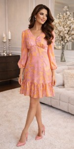 29 Satynowa sukienka SEMPER Talida z falbaną – różowo-brzoskwiniowa w kwiaty