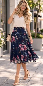 Krój: lekko rozkloszowany, sięgający za kolano (midi), pięknie układa się podczas ruchu, dodając sylwetce lekkości i wdzięku.