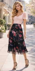 Postaw na ponadczasową kobiecość i elegancję z wyjątkową spódnicą midi marki Gralux. Ten model zachwyca subtelnym, romantycznym wzorem kwiatowym w odcieniach różu, bordo i granatu na czarnym tle, tworząc stylizację idealną na każdą okazję – od codziennych spotkań po eleganckie wyjścia.