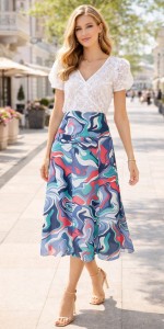 138 Kolorowa spódnica midi z artystycznym wzorem – Gralux