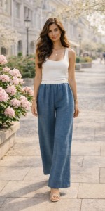 Uszyte z wysokiej jakości mieszanki (50% bawełna, 50% poliester), są lekkie, przewiewne i przyjemne dla skóry. Szerokie nogawki typu palazzo nadają sylwetce lekkości i elegancji, a elastyczna gumka w pasie zapewnia maksymalny komfort noszenia przez cały dzień.