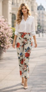 Spodnie damskie w kwiatowy wzór Van der Elst – elegancja i świeżość wiosny