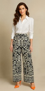 Spodnie mają gumkę w pasie, dzięki czemu idealnie dopasowują się do figury, a dodatkowo zostały wyposażone w praktyczne kieszenie po bokach – wygodne rozwiązanie na co dzień. Modny, etniczny wzór w klasycznym połączeniu czerni i ecru sprawia, że spodnie prezentują się wyjątkowo stylowo i pasują zarówno do eleganckiej koszuli, jak i luźnego topu.