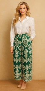 Spodnie damskie letnie z wiskozy – zielone z orientalnym wzorem