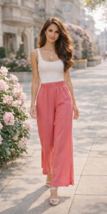 Model wyróżnia się modnym, szerokim krojem nogawek oraz delikatnymi rozcięciami po zewnętrznej stronie u dołu, które dodają lekkości i subtelnej elegancji. Elastyczna gumka w pasie gwarantuje idealne dopasowanie do sylwetki i wygodę użytkowania.