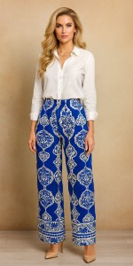 Spodnie mają luźny, swobodny krój z szerokimi nogawkami, które pięknie układają się w ruchu. Elastyczna guma w pasie gwarantuje idealne dopasowanie do sylwetki, a praktyczne kieszenie po bokach dodają funkcjonalności. Kobaltowo-biały wzór nadaje całości elegancji i przyciąga uwagę, dzięki czemu spodnie sprawdzą się zarówno w codziennych stylizacjach, jak i w bardziej wyjściowych zestawieniach.
