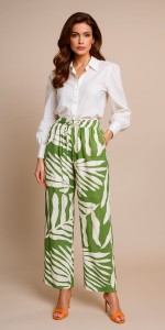 Spodnie mają luźny, prosty fason z szeroką nogawką, co nadaje im swobodnego, stylowego charakteru i sprawia, że pasują zarówno do eleganckiej koszuli, jak i do casualowego topu. Wyjątkowy zielono-biały print w tropikalny, roślinny motyw dodaje im lekkości i podkreśla wakacyjny klimat.