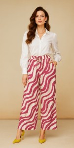 Spodnie letnie z wiskozy – różowo-kremowy wzór fal