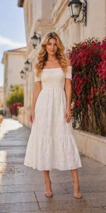 Sukienka marki Jasmin to kwintesencja letniej elegancji i swobody. Wykonana w 100% z naturalnej bawełny, zachwyca subtelnym ażurowym wzorem oraz romantycznym fasonem typu hiszpanka, który pięknie podkreśla ramiona i dekolt.
