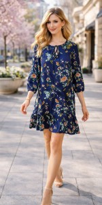 Granatowa baza została ozdobiona subtelnym, romantycznym wzorem kwiatowym, który dodaje sukience świeżości i modnego charakteru. Dekolt z wiązaniem oraz delikatna falbana u dołu nadają całości lekkości i kobiecego uroku.