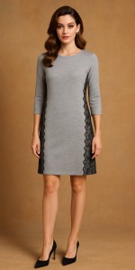 Model w odcieniu szarości wyróżnia się asymetrycznym, falistym wykończeniem boków, które subtelnie podkreślono wstawką z czarnej koronki. Dzięki temu sukienka nabiera unikalnego, kobiecego charakteru.