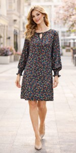 Sukienka utrzymana jest w modnym charakterze codzienno-eleganckim. Luźniejszy fason subtelnie maskuje niedoskonałości, a ozdobny dekolt z wiązaniem oraz lekko bufiaste rękawy zakończone marszczonym mankietem dodają całości kobiecego, stylowego wykończenia.