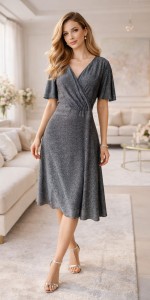 Elegancka sukienka kopertowa Inter Irex – grafitowa z subtelnym wzorem, rozkloszowany dół