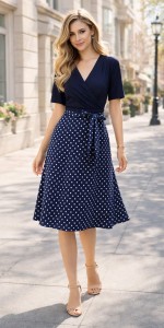 112 Elegancka sukienka kopertowa Inter Irex – granatowa w białe groszki | lekka, zwiewna, wiązana w talii