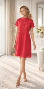 Góra sukienki przyciąga uwagę dopracowanymi detalami — pionowe plisowania wysmuklają sylwetkę, a ozdobne, materiałowe guziki biegnące przez środek dodają jej wyjątkowego, szlachetnego charakteru. Krótki rękaw i delikatnie odcinana talia podkreślają proporcje figury, natomiast lekko rozkloszowany dół nadaje całości miękkości i swobody ruchu.