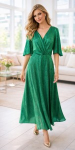 Sukienka w głębokim, szmaragdowym odcieniu zieleni wyróżnia się subtelnym, drobno mieniącym się efektem (delikatny połysk), który dodaje całości luksusowego charakteru. Klasyczny, kopertowy dekolt oraz zwiewny fason maxi sprawiają, że model prezentuje się niezwykle elegancko i ponadczasowo.