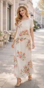 31 Sukienka maxi Teresa Kopias w kremowym odcieniu z romantycznym kwiatowym printem – elegancka i lekka