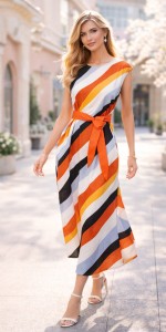 Sukienka SUNWEAR IS206-2-20 to wyrazista i niezwykle kobieca propozycja na sezon wiosna–lato. Model o długości midi zachwyca nowoczesnym, dynamicznym wzorem w szerokie, diagonalne pasy, które optycznie wysmuklają sylwetkę i nadają stylizacji modnego charakteru.