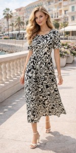 Sukienka oversize Jasmin „Monochrome Elegance” – czarno-kremowy wzór, lekka i przewiewna