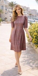 Elegancka sukienka w pepitkę Teresa Kopias – pudrowy róż i głęboki granat | Kobiecy fason z bufiastym rękawem