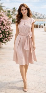 Elegancka sukienka Teresa Kopias – pudrowy róż z wiązaniem w talii | lekka, kobieca