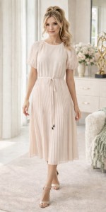 27 Romantyczna szyfonowa sukienka MIDI VERA MONI – pudrowy beż, plisowany dół, elegancki fason